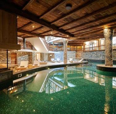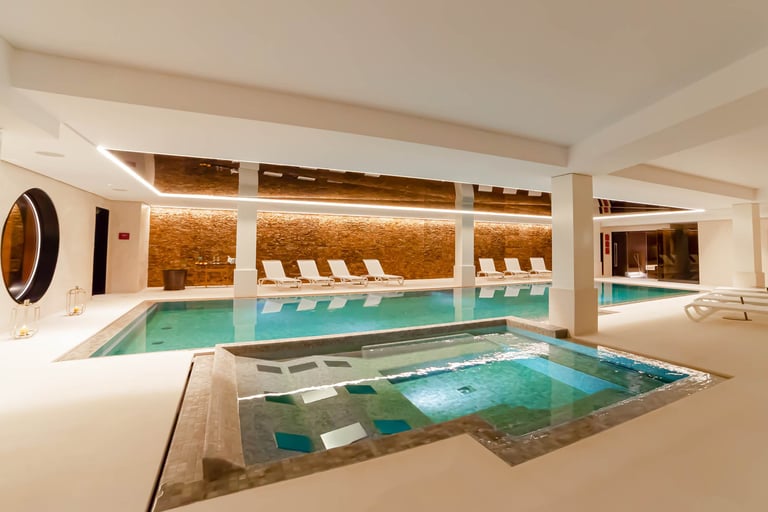 Elegant spa with panoramic mountain views, indoor pool, sauna, hammam and tailored treatments—perfect for couples and premium wellness stays.