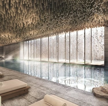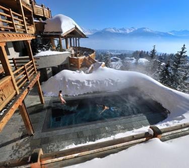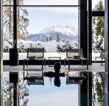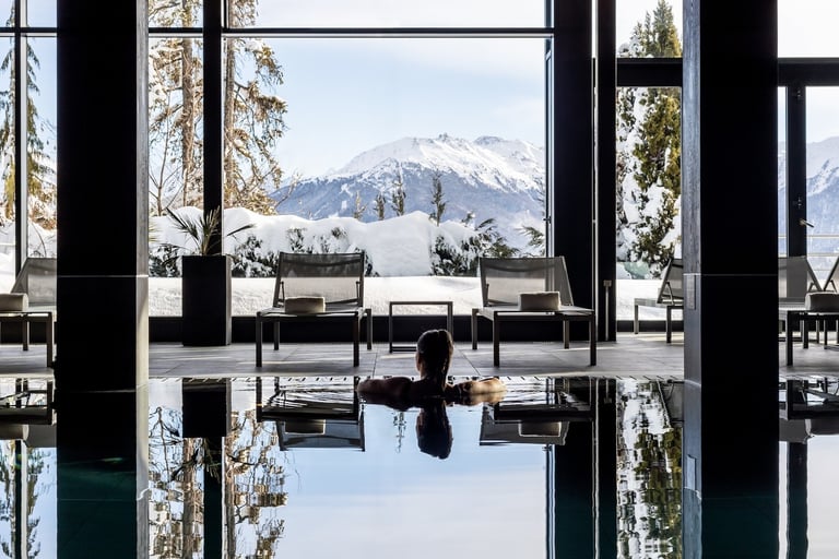 World-class spa at a luxury Alpine resort with indoor and outdoor wellness facilities, unique therapies and panoramic mountain views. Ideal for recovery and relaxation after skiing.