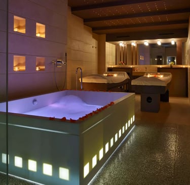 1,300 m² spa with pool, sauna, hammam, fitness and anti-aging treatments created in collaboration with a scientific wellness brand. Ideal for deep recovery and luxury relaxation.