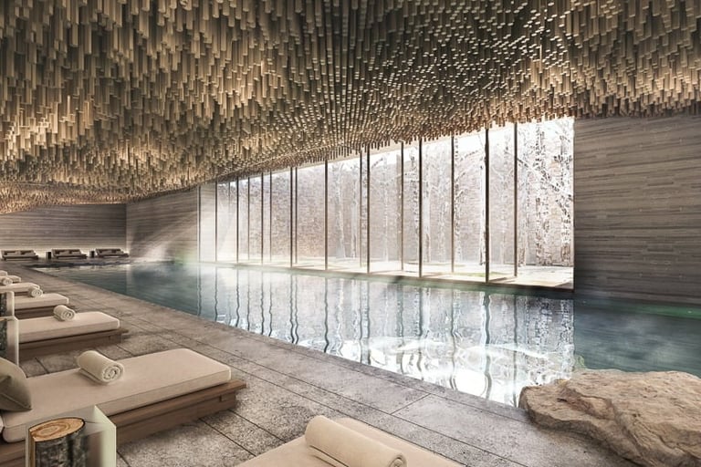 Peaceful wellness area with indoor/outdoor pool, sauna, steam room and relaxation spaces that can often be accessed by external guests.